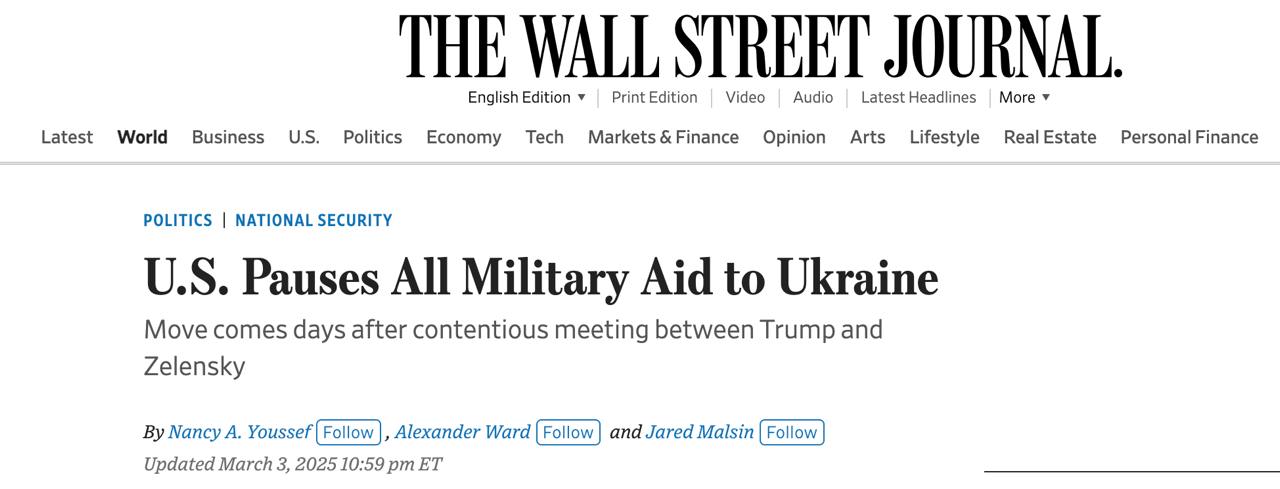 Как пишет The Wall Street Journal со ссылкой на источники, остановка американской военной помощи является "демонстрацией" Украине, что Трамп настроен серьезно склонить ее к мирным переговорам с РФ.