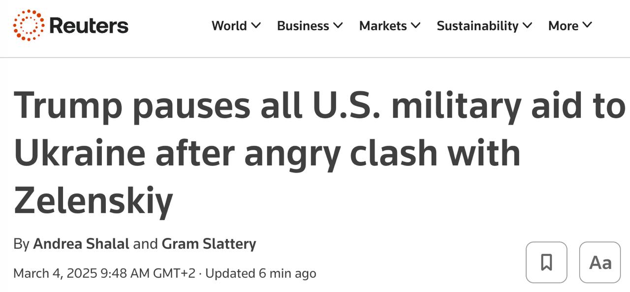 В свою очередь Reuters также пишет, что Трамп остановил военную помощь Украине. Издание ссылается на представителя Белого дома.