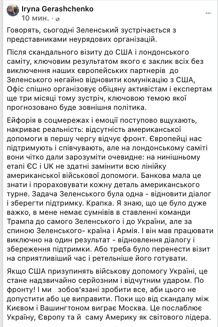 "Европейцы нас поддерживают и сочувствуют, но на лондонском саммите они четко дали понять очевидное: на данном этапе ЕС и Великобритания не способны заменить всю линейку американской военной помощи. Банковая должна была это знать и просчитывать каждую деталь американского турне", - пишет Геращенко.