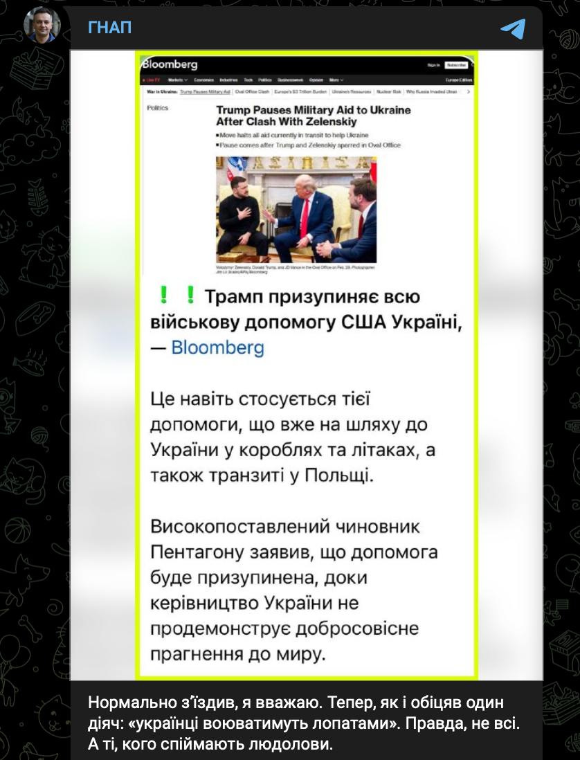 Журналист Дмитрий Гнап, который сейчас служит в ВСУ, также увязал отказ в поставках оружия с провальным визитом Зеленского к Трампу.