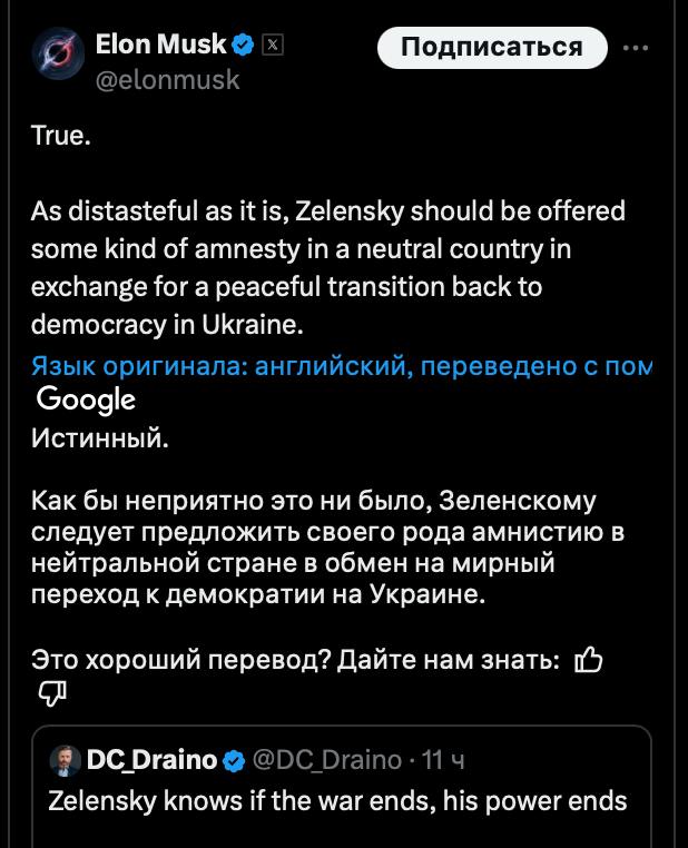 Так миллиардер Трампа прокомментировал сторонний пост в Х американского политического обозревателя правого толка Рогана О'Хэндли с таким текстом: "Зеленский знает, что если война закончится, его власть закончится".