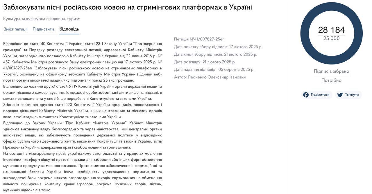На сайте Кабинета министров в феврале набрала необходимые 25 тысяч голосов петиция с призывом заблокировать в Украине музыку на русском языке, в том числе украинских артистов. Автор петиции в призыве имел в виду блокировку музыки на стриминговых платформах Apple Music, Spotify и других.