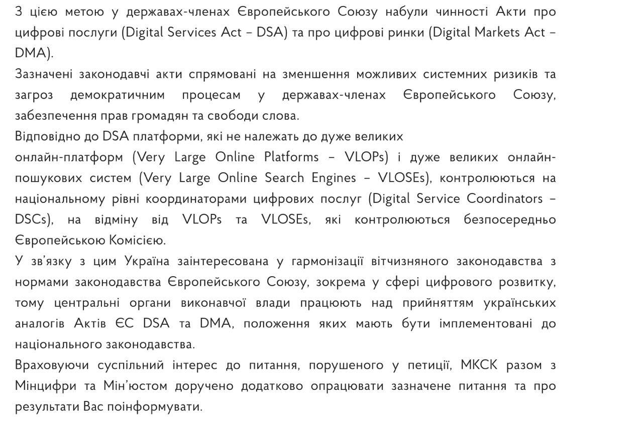 "На сегодняшний день в международном праве, украинском законодательстве и в правилах вещания иностранных платформ отсутствуют правовые основания для запрета или других форм ограничения музыкального продукта по языковому признаку. Однако в целях обеспечения информационной и национальной безопасности Украины существует необходимость усовершенствования нормативной и законодательной базы, в частности, путем введения мер, направленных на ограничение свободного распространения контента страны-агрессора, в частности, музыкальных произведений, песен, музыкальных видеоклипов и т.д.", - говорится в ответе.