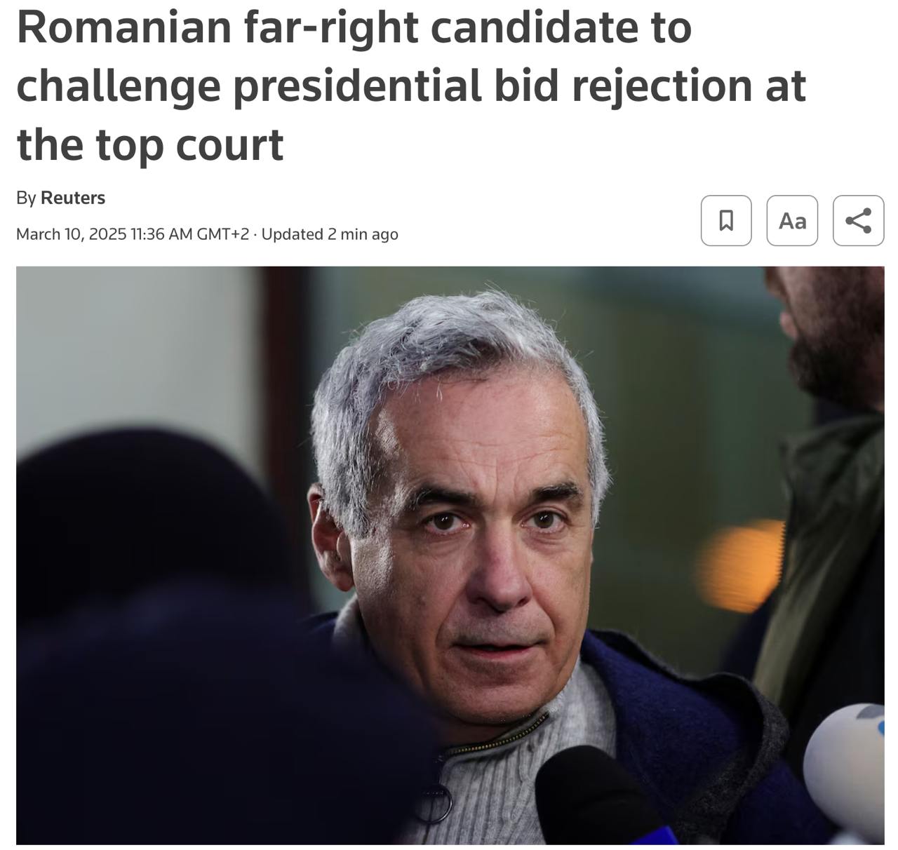 Джордже Симион, лидер оппозиционного Альянса за объединение румын, второй по величине партии в парламенте Румынии, заявил, что "не исключает никаких вариантов", когда его спросили о возможности баллотироваться вместо Джорджеску.