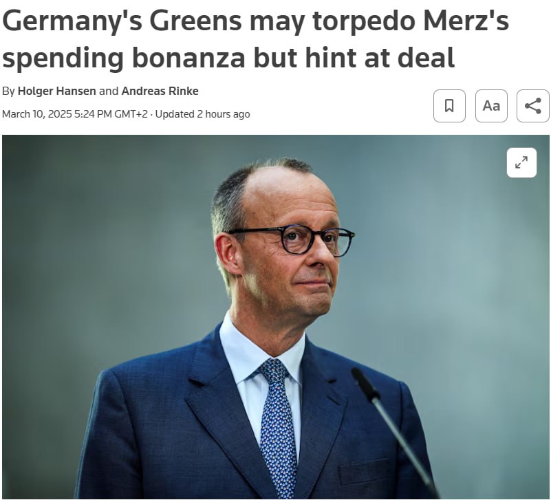 По информации агентства, партия "Зеленых" может не поддержать план Фридриха Мерца по увеличению государственных расходов и созданию специального фонда в 500 млрд евро, большая часть из которых должна пойти на оборонный сектор. Один из представителей партии отметил, что "одобрение становится все менее вероятным с каждым днем". "Зеленые" хотят, чтобы фонд также финансировал дополнительные меры по защите климата.