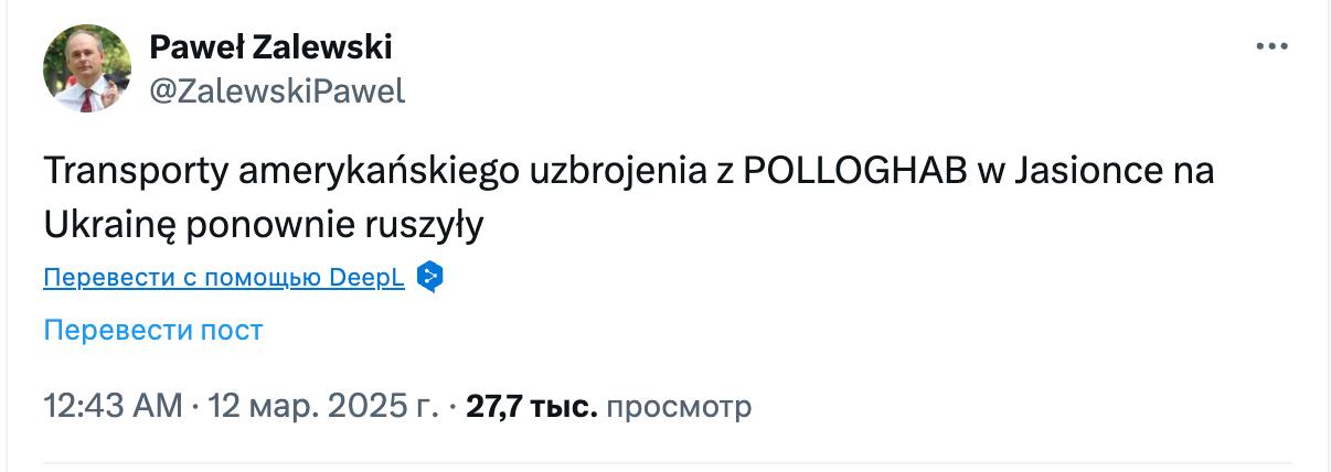 Об этом сообщил в соцсети Х заместитель министра национальной обороны Польши Павел Залевский.