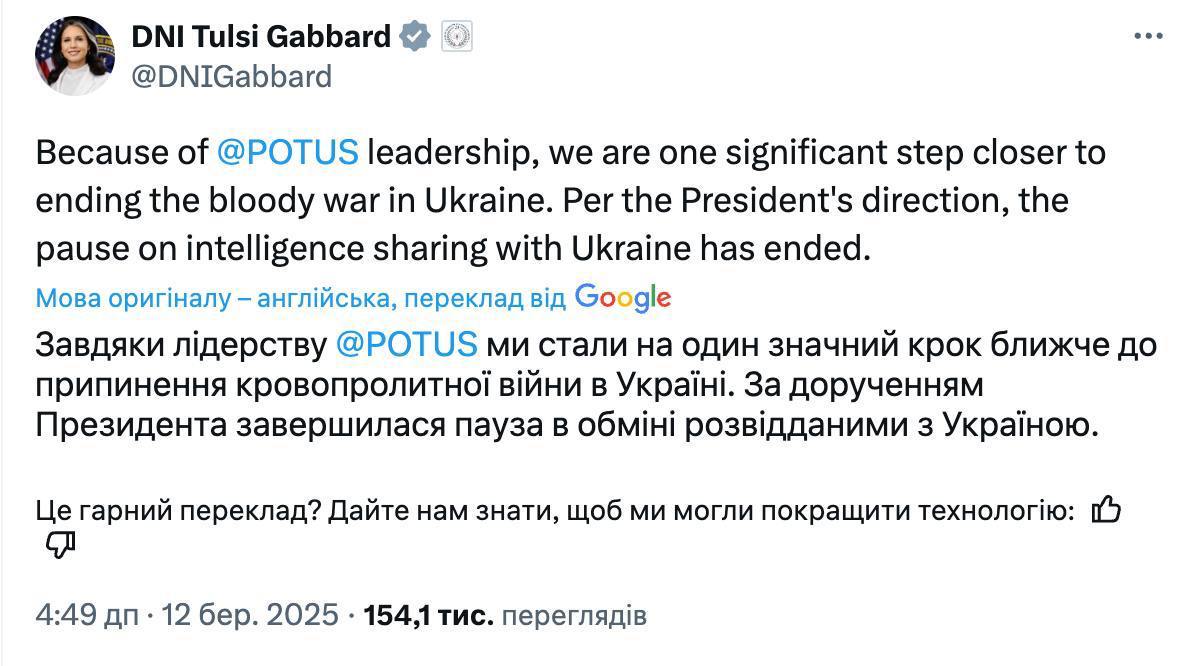 "Благодаря лидерству президента США мы на один значительный шаг приблизились к окончанию кровавой войны в Украине. По указанию президента пауза в обмене разведданными с Украиной закончилась", - написала Габбард в Х.