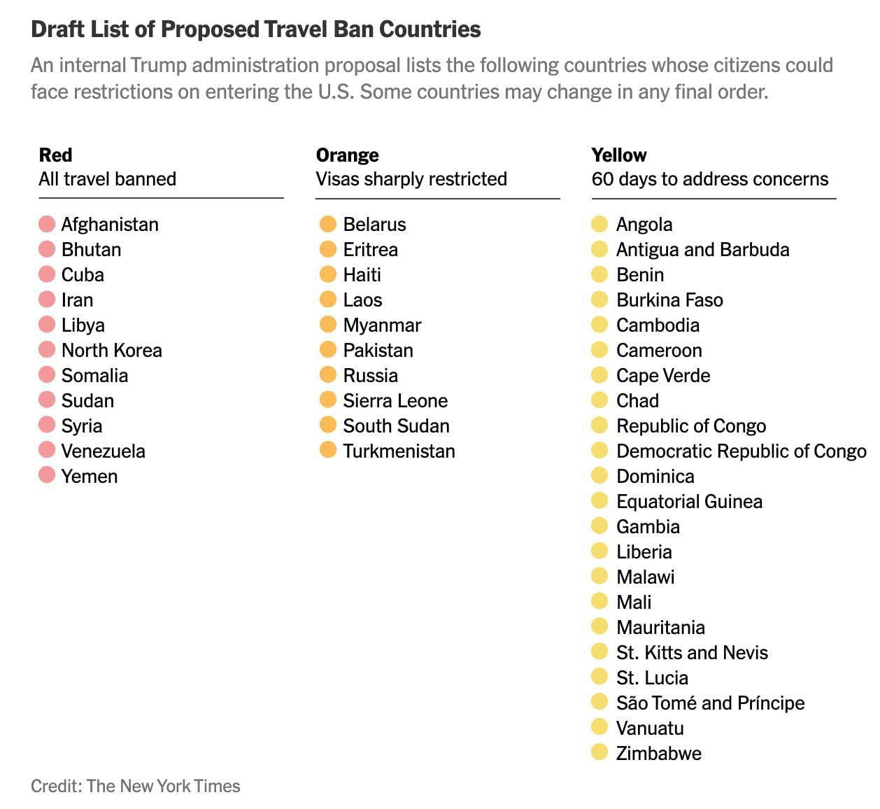 В красную категорию с полным запретом на въезд попадут граждане Афганистана, Бутана, Кубы, Ирана, Ливии, Северной Кореи, Сомали, Судана, Сирии, Венесуэлы и Йемена.