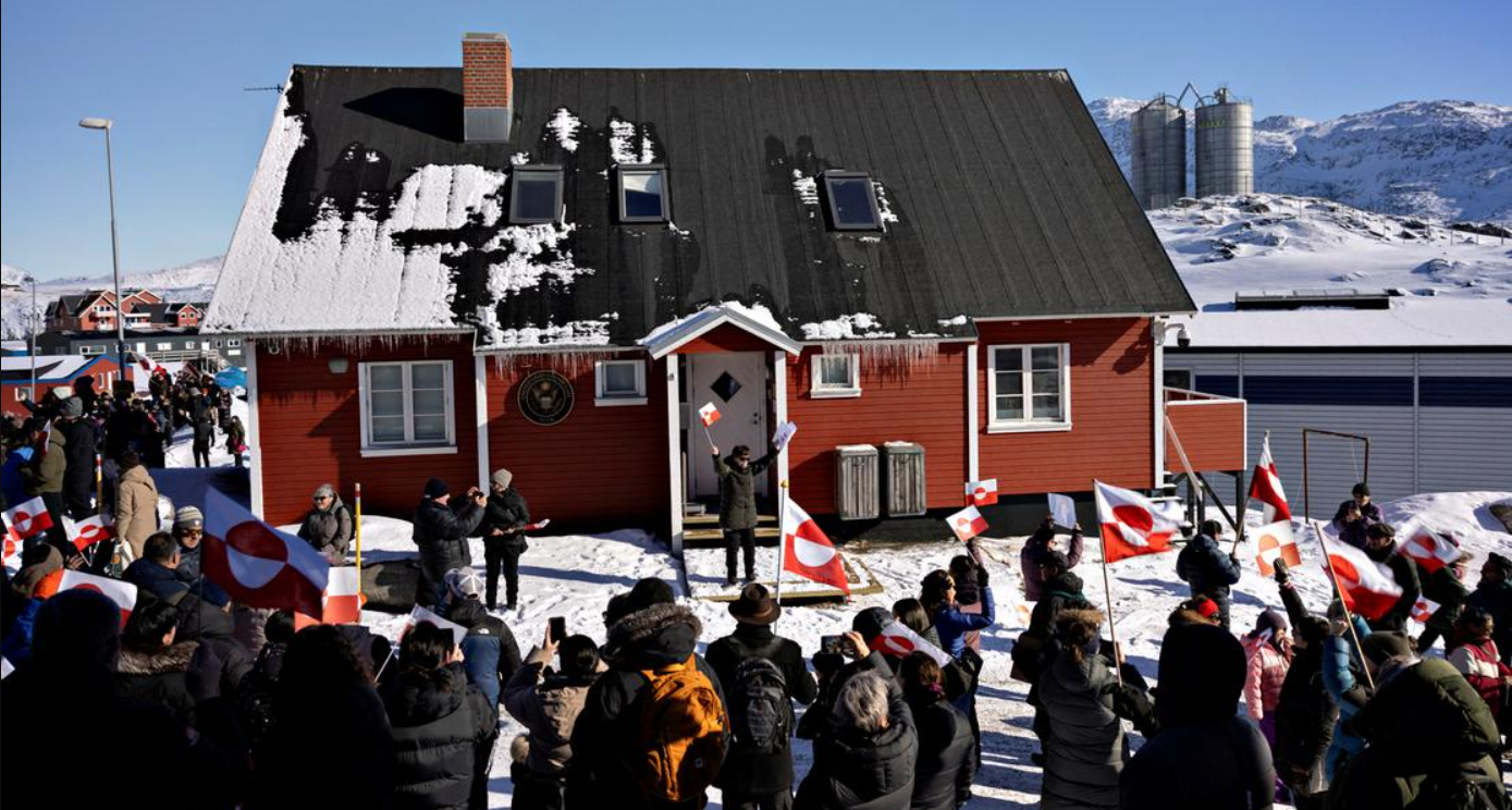 К лидеру партии "Демократические рубежи", победившей на парламентских выборах на этой неделе, Йенсу-Фредерику Нильсену присоединился уходящий премьер-министр Муте Б. Эгеде, чтобы повести протестующих к консульству США на окраине Нуука.