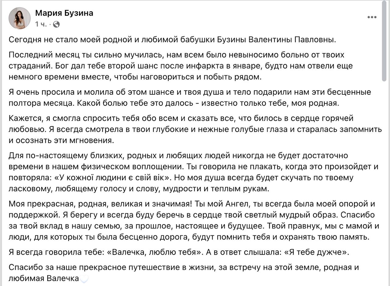 Об этом сообщила ее внучка Мария Бузина на своей странице в Facebook.