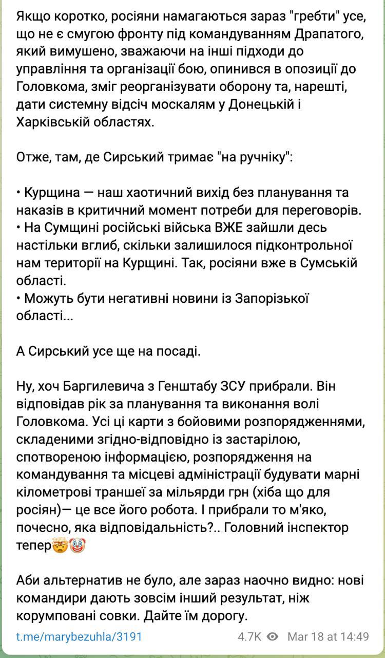 Также она в очередной раз обвинила военное командование Украины, на сей раз за хаос при отходе с позиций в Курской области.