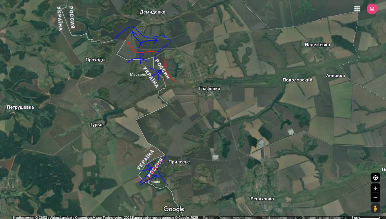 Продолжаются, по данным российских пабликов, бои на границе Сумской и Белгородской областей, где ВСУ атакуют приграничные российские села.