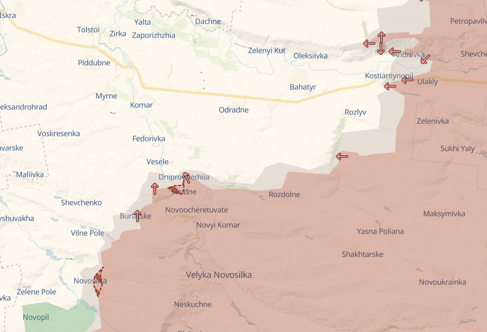 Россияне зашли в Новоселку на юге Донецкой области, свидетельствует карта Deep State. Также они продвинулись севернее, в районе Скудного, где пытаются двигаться в сторону трассы на Запорожье.