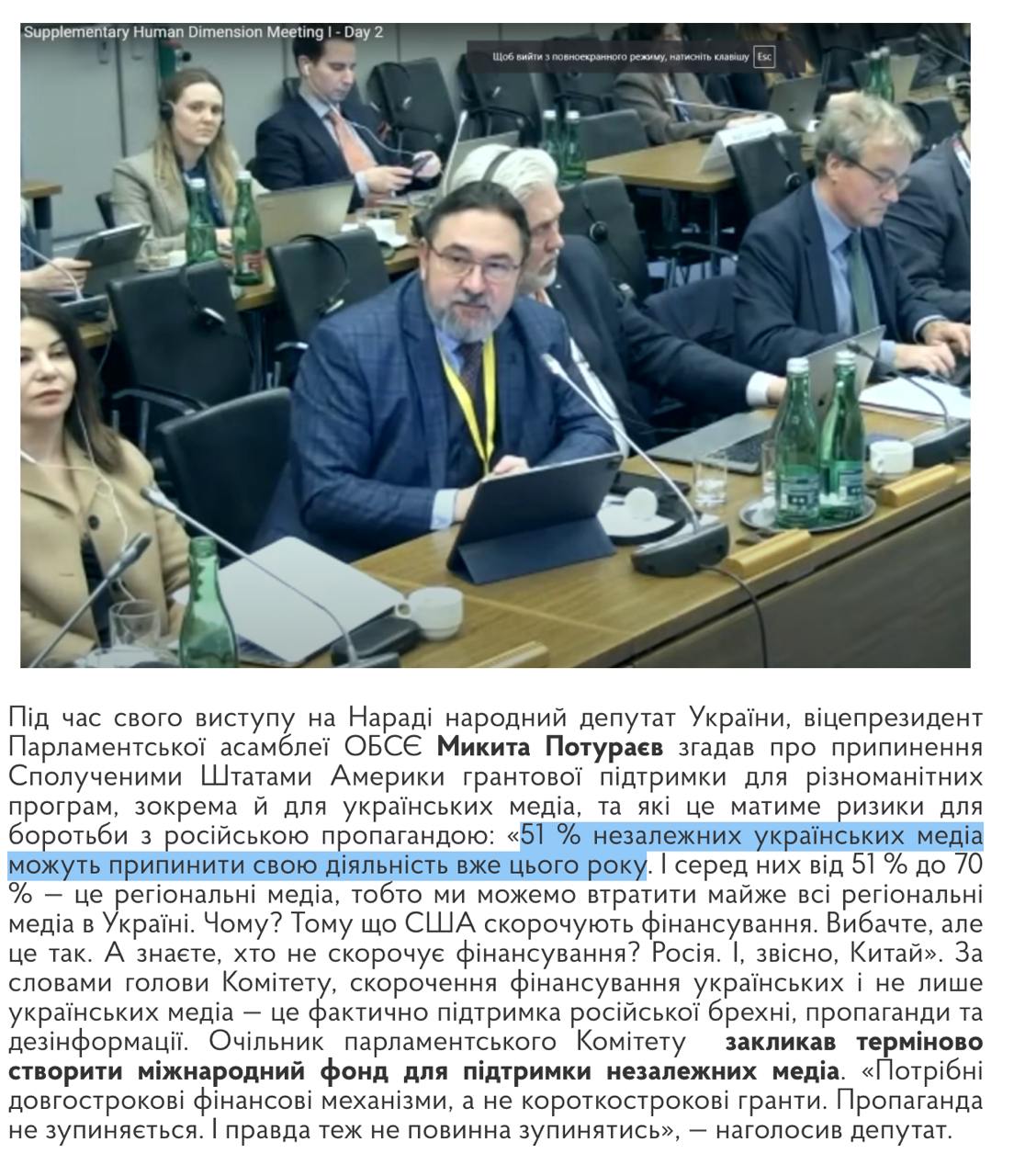 "51% независимых украинских медиа могут прекратить свою деятельность уже в этом году. И среди них от 51% до 70% - это региональные медиа, то есть мы можем потерять почти все региональные медиа в Украине. Почему? Потому что США сокращают финансирование. Простите, но это так. А знаете, кто не сокращает финансирование? Россия. И, конечно, Китай", - сказал нардеп.