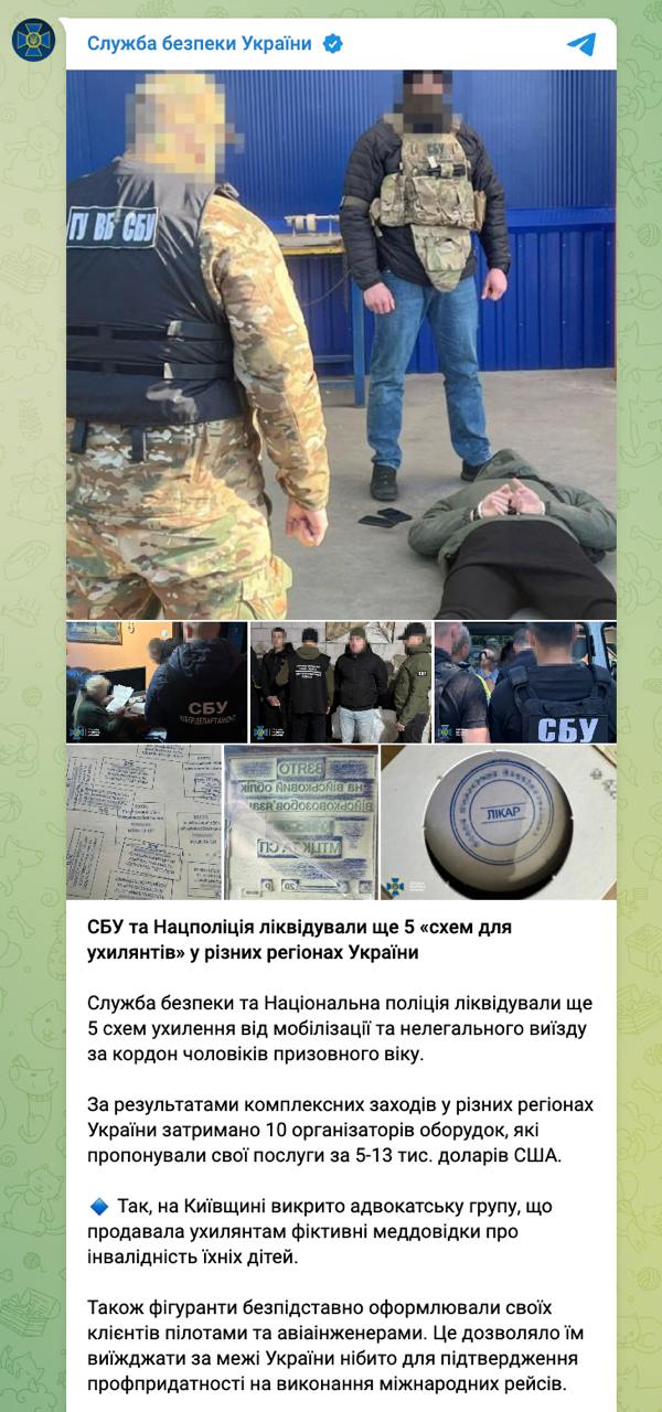 Как сообщает СБУ, в Киевской области адвокатская группа продавала мужчинам фиктивные медсправки об инвалидности их детей, а также оформляла их пилотами и авиаинженерами. Это позволяло мужчинам выезжать за границу для подтверждения профпригодности на выполнение международных рейсов и не возвращаться обратно.