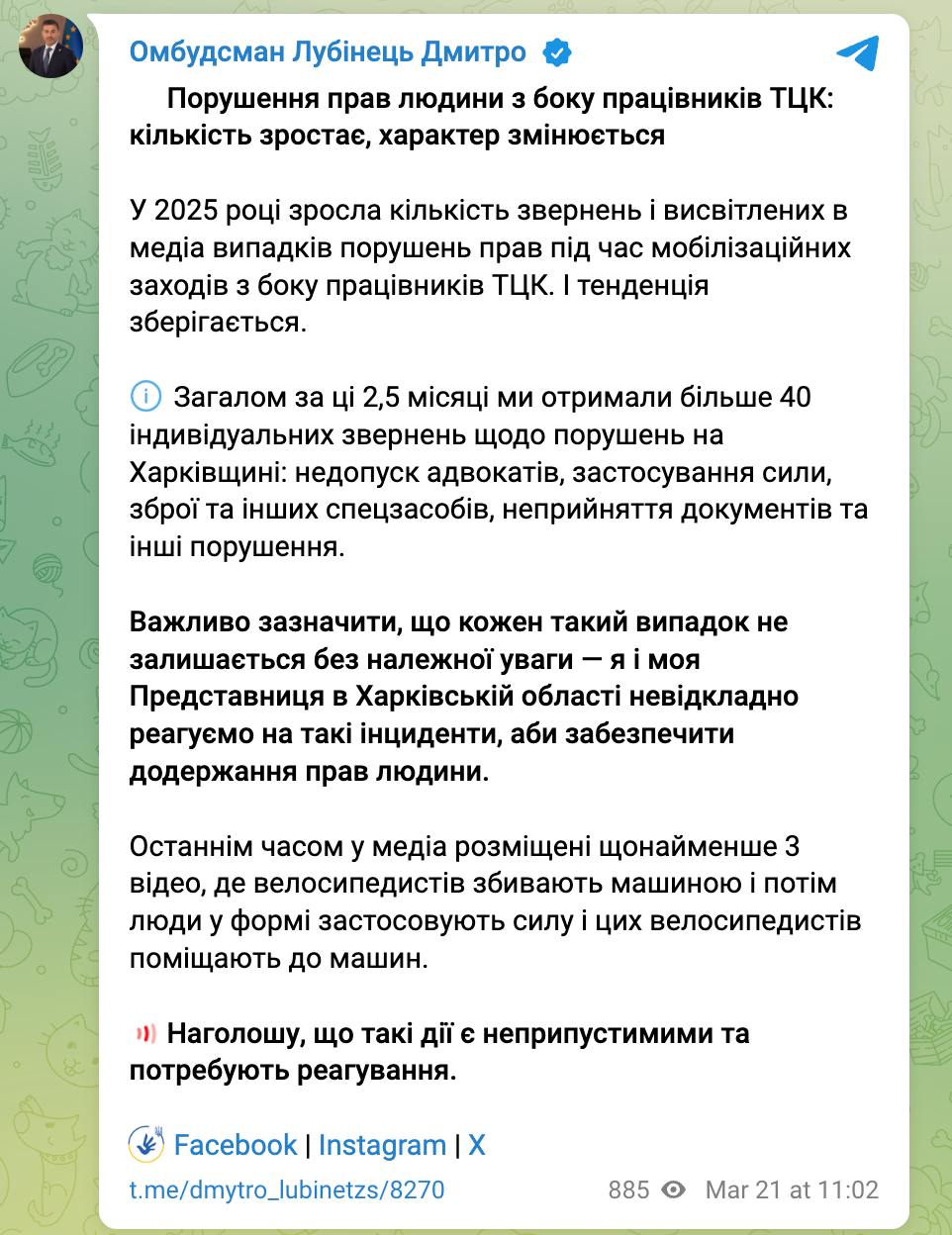 11:15 ТЦК стали чаще нарушать права человека во время мобилизации в 2025 году, сообщает омбудсмен Дмитрий Лубинец.