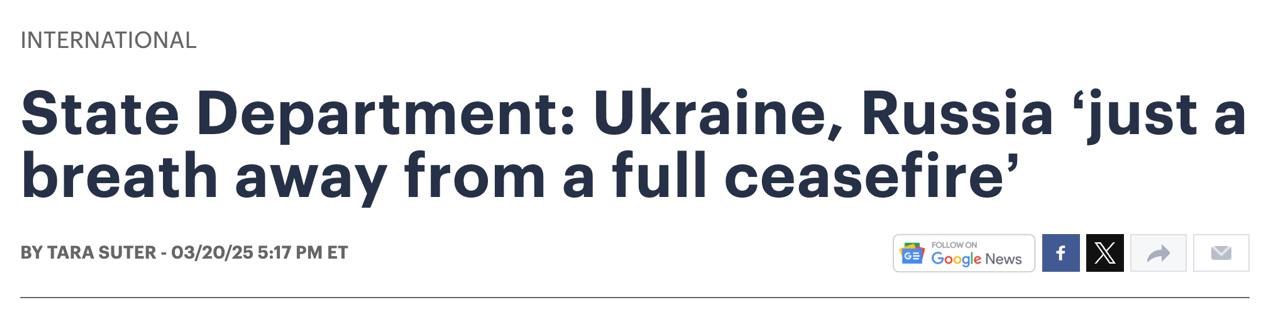 "Мы всего в одном шаге от полного прекращения огня, и тогда мы сможем говорить не просто о мире на неделю или шесть месяцев, а о прочном мире, на который смогут рассчитывать люди в Украине, России и во всём мире. Именно это Америка помогла обеспечить, и именно этим мы продолжаем заниматься каждый день. Мы никогда не были ближе к миру с этими двумя сторонами", - заявила представитель Госдепартамента Тэмми Брюс в интервью "NewsNation Now", передает The Hill.