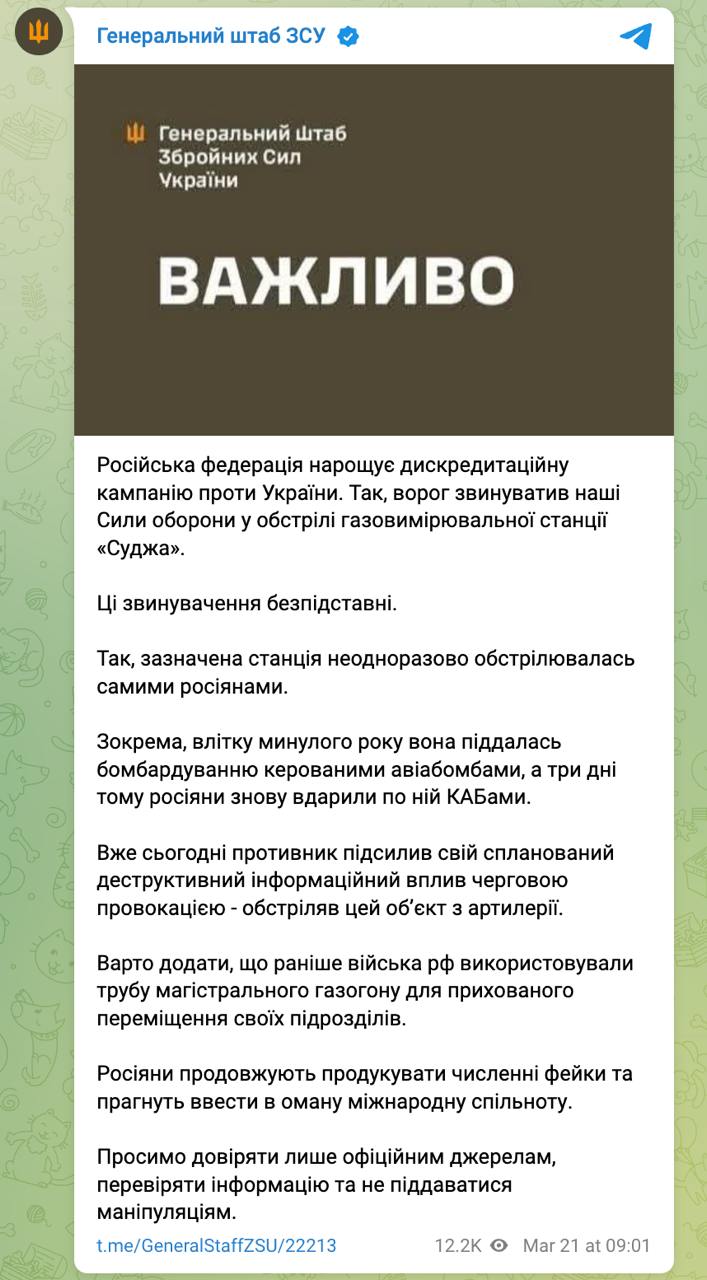 "Враг обвинил наши Силы обороны в обстреле газоизмерительной станции "Суджа". Эти обвинения безосновательны. Указанная станция неоднократно обстреливалась самими россиянами. Сегодня противник усилил спланированное деструктивное информационное влияние очередной провокацией - обстрелял этот объект из артиллерии", - говорится в сообщении.