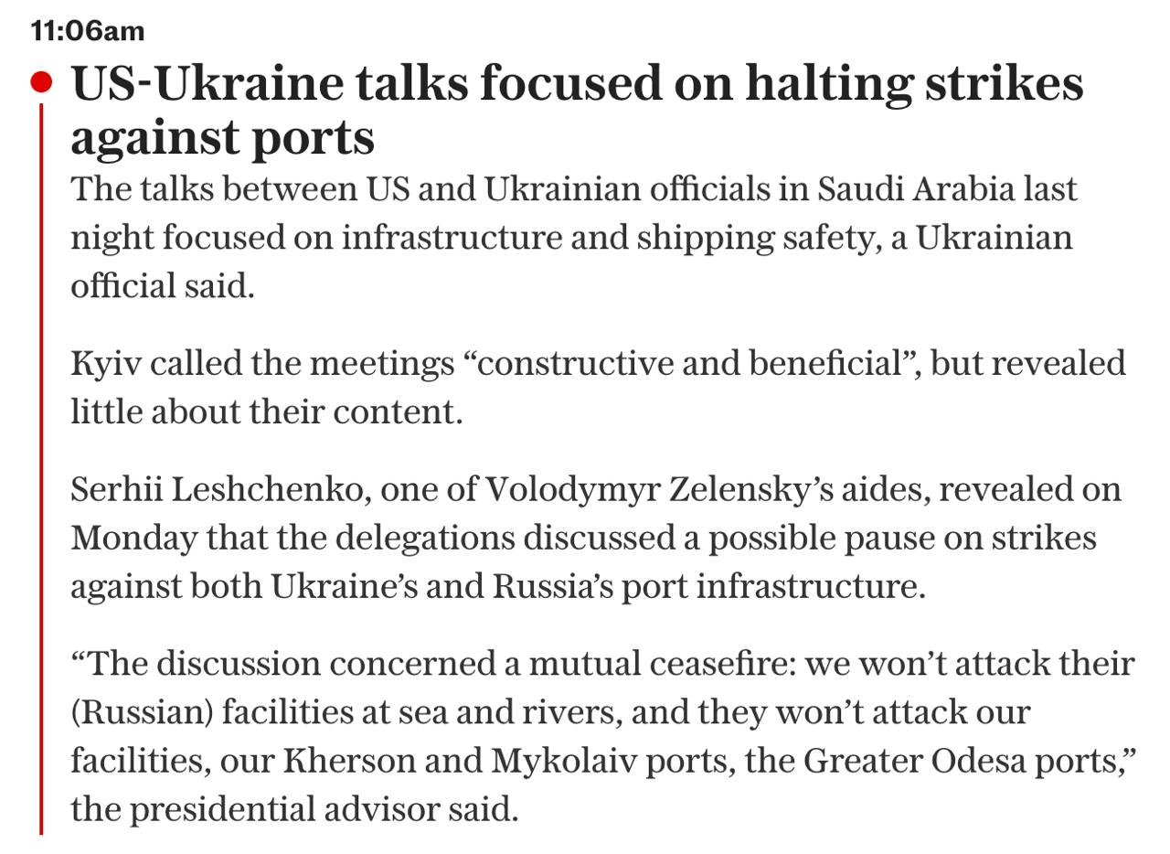Украина и США в ходе вчерашних переговоров в Саудовской Аравии обсуждали кроме прочего прекращение ударов по портам.