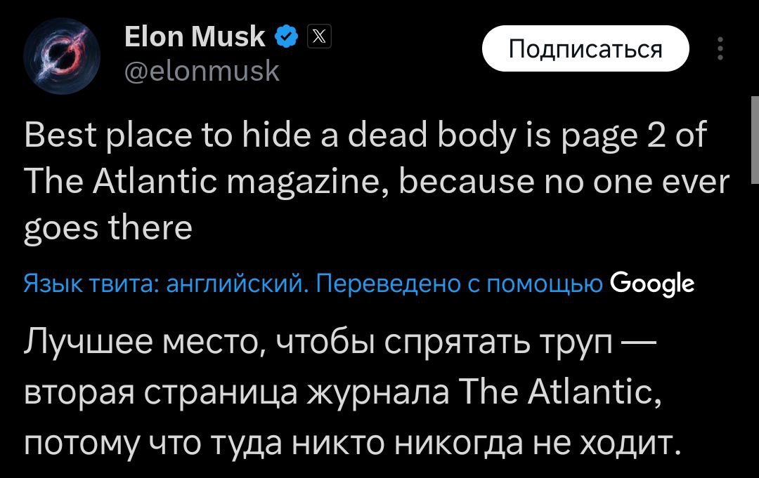 О том же написал Илон Маск: "Лучшее место спрятать труп - вторая страница журнала The Atlantic, потому что туда никто никогда не заходит".