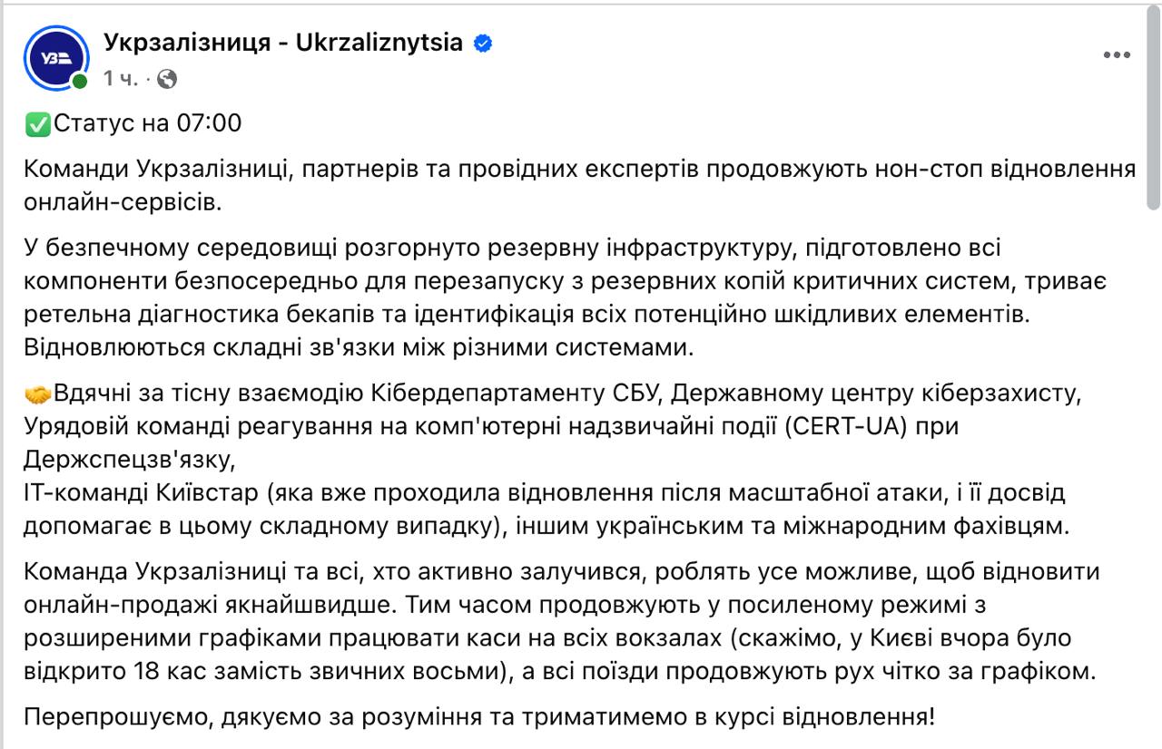 "Команда Укрзализныци и все, кто активно участвует, делают все возможное, чтобы восстановить онлайн-продажи как можно быстрее. Между тем продолжают в усиленном режиме с расширенными графиками работать кассы на всех вокзалах (например, в Киеве вчера было открыто 18 касс вместо привычных восьми), а все поезда продолжают движение четко по графику", - говорится в сообщении.