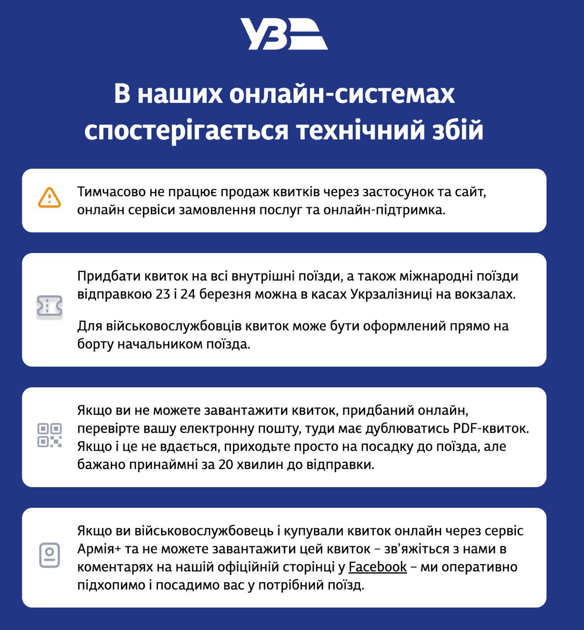 Напомним, 23 марта произошел масштабный сбой онлайн-сервисов "Укрзализныци". Перестали работать продажа билетов через приложение и сайт, сервисы заказа услуг и справка.