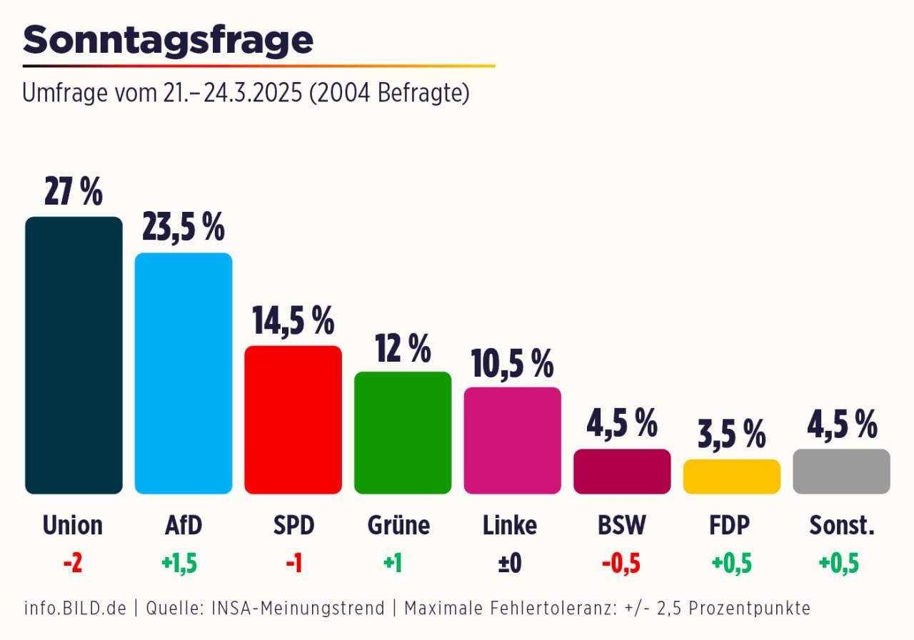 Свободная демократическая партия (СвДП) поднялась до 3,5% (+0,5%), а Социал-демократическая партия (СДПГ) потеряла один пункт - теперь у нее 14,5%. Левые (10,5%) сохранили свой результат.