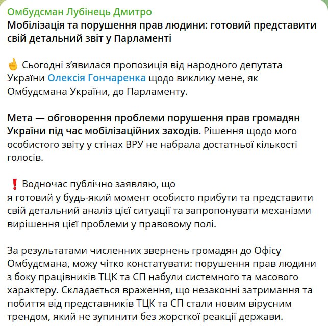 Уполномоченный Верховной Рады Украины по правам человека Дмитрий Лубинец опубликовал перечень основных злоупотреблений сотрудников ТЦК.