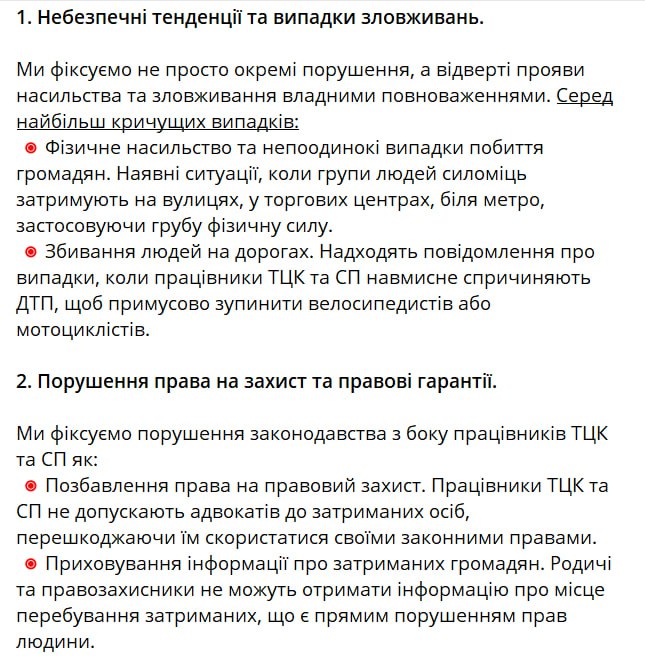 - Избиение людей на дорогах. Поступают сообщения о случаях, когда сотрудники ТЦК умышленно приводят к ДТП, чтобы принудительно остановить велосипедистов или мотоциклистов.