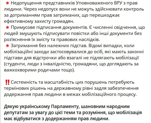 - Задержание без надлежащих оснований. Известны случаи, когда мобилизационные меры применялись к лицам, имеющим законные основания для отсрочки или вообще не подлежащих мобилизации (студенты, люди с инвалидностью, ухаживающие за тяжелобольными родственниками и т.п.).