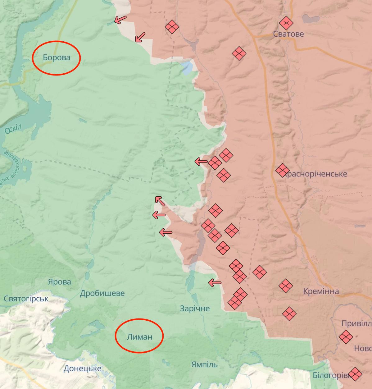 По информации организации, армия РФ может попытаться в ближайшие месяцы зайти севернее на Боровую или южнее на Лиман.