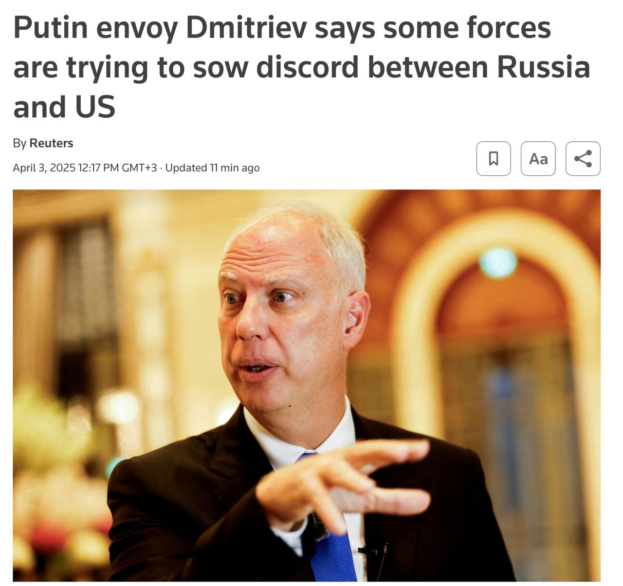 В комментарии Reuters Дмитриев отметил, что некие силы пытаются поссорить Россию и США, искажая позицию Москвы.