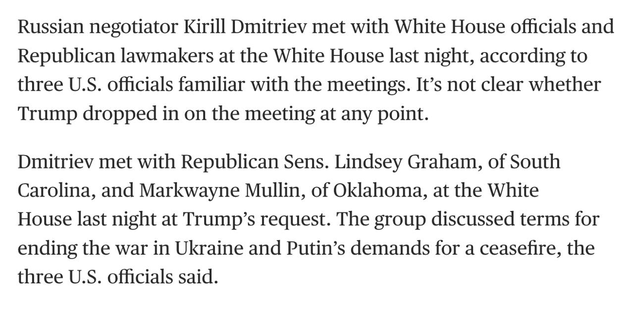 NBC News со ссылкой на источники сообщает, что Дмитриев провел в Штатах встречи не только с командой Трампа, но и с сенаторами.