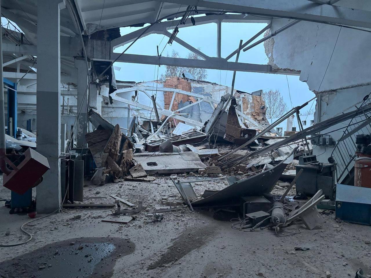 Разрушены два здания авторемонтных предприятия в районе Броваров, повреждены семь автомобилей и два погрузчика. Также повреждены окна и фасад АЗС.