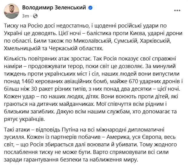 "Давления на Россию до сих пор недостаточно, и ежедневные российские удары по Украине это доказывают. Этой ночью – баллистика против Киева, ударные дроны по области. Били также по Николаевской, Сумской, Харьковской, Хмельницкой и Черкасской областях. Число воздушных атак растет. Россия продолжает террор, пока мир это позволяет", - пишет Зеленский и призывает к усилению давления на РФ.