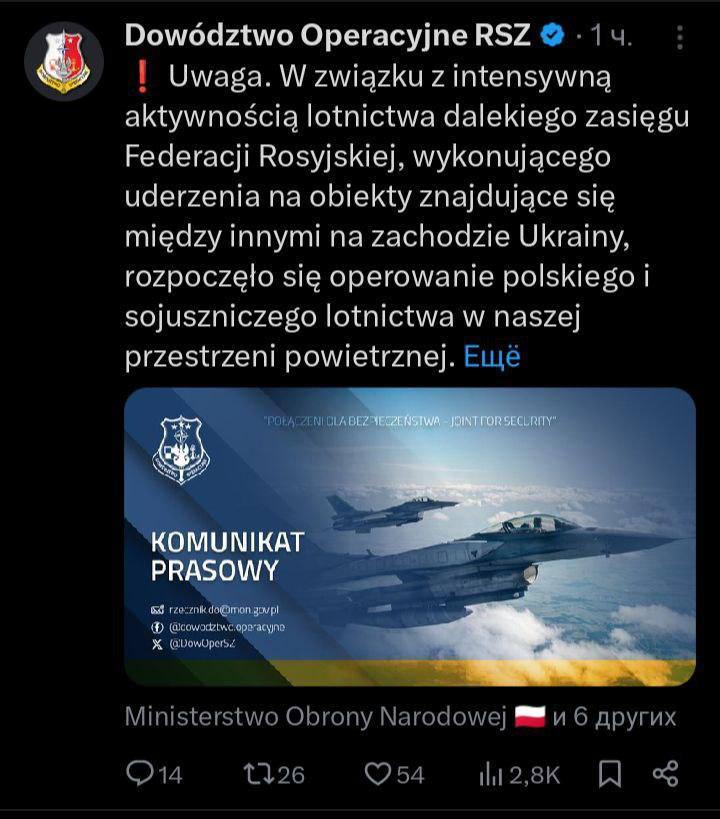 09:25 Польша сегодня ночью поднимала в воздух свою авиацию - из-за взлета стратегических бомбардировщиков РФ.
