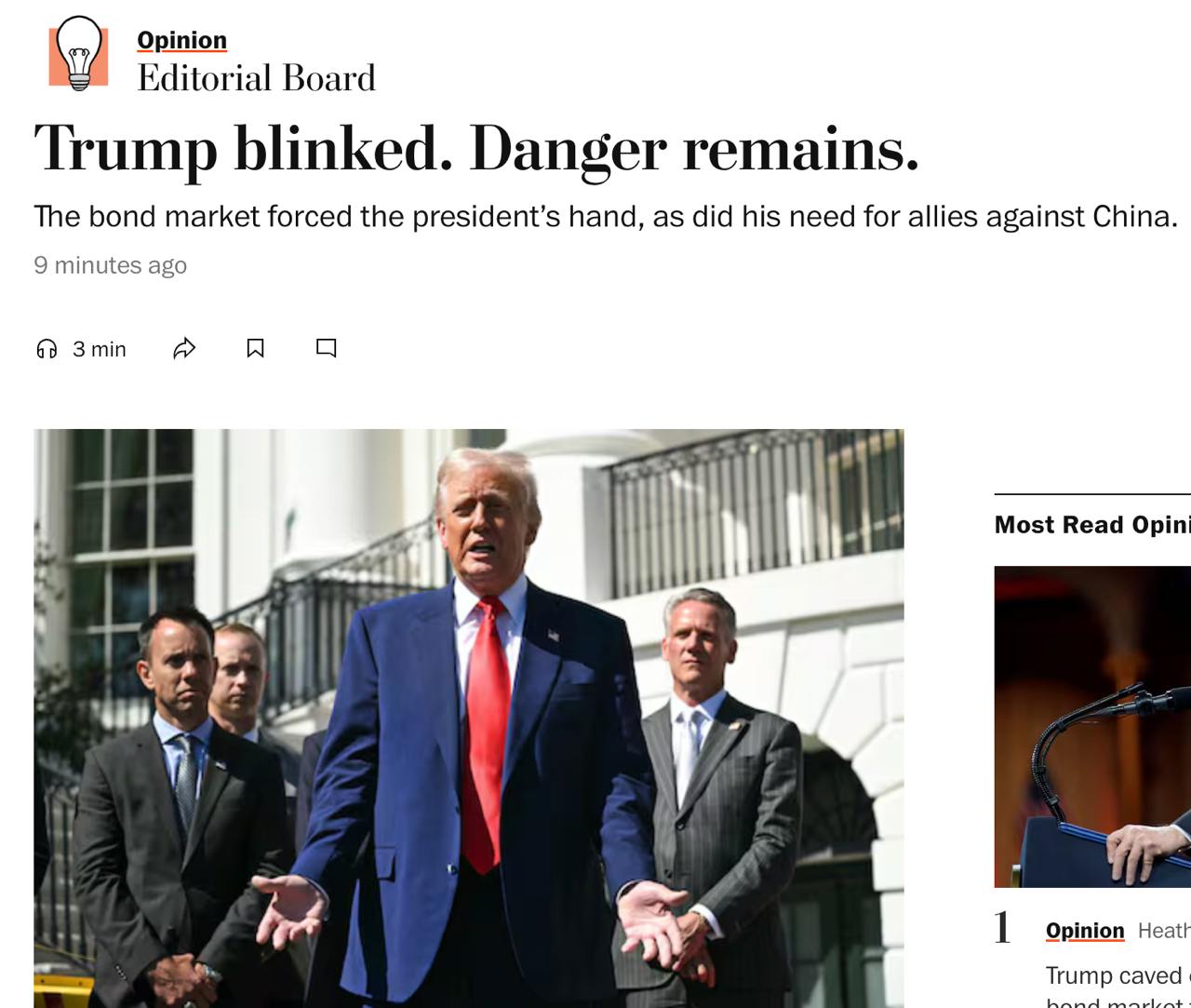 Об этом сообщает Washington Post в своей редакционной колонке, комментируя объявленную Трампом паузу в введении пошлин.