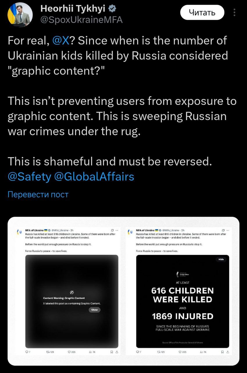 "Серьезно, X? С тех пор количество украинских детей, убитых Россией, считается "шокирующим контентом"? Это не о защите пользователей от жестких изображений. Это - замалчивание военных преступлений России", - написал Тихий.