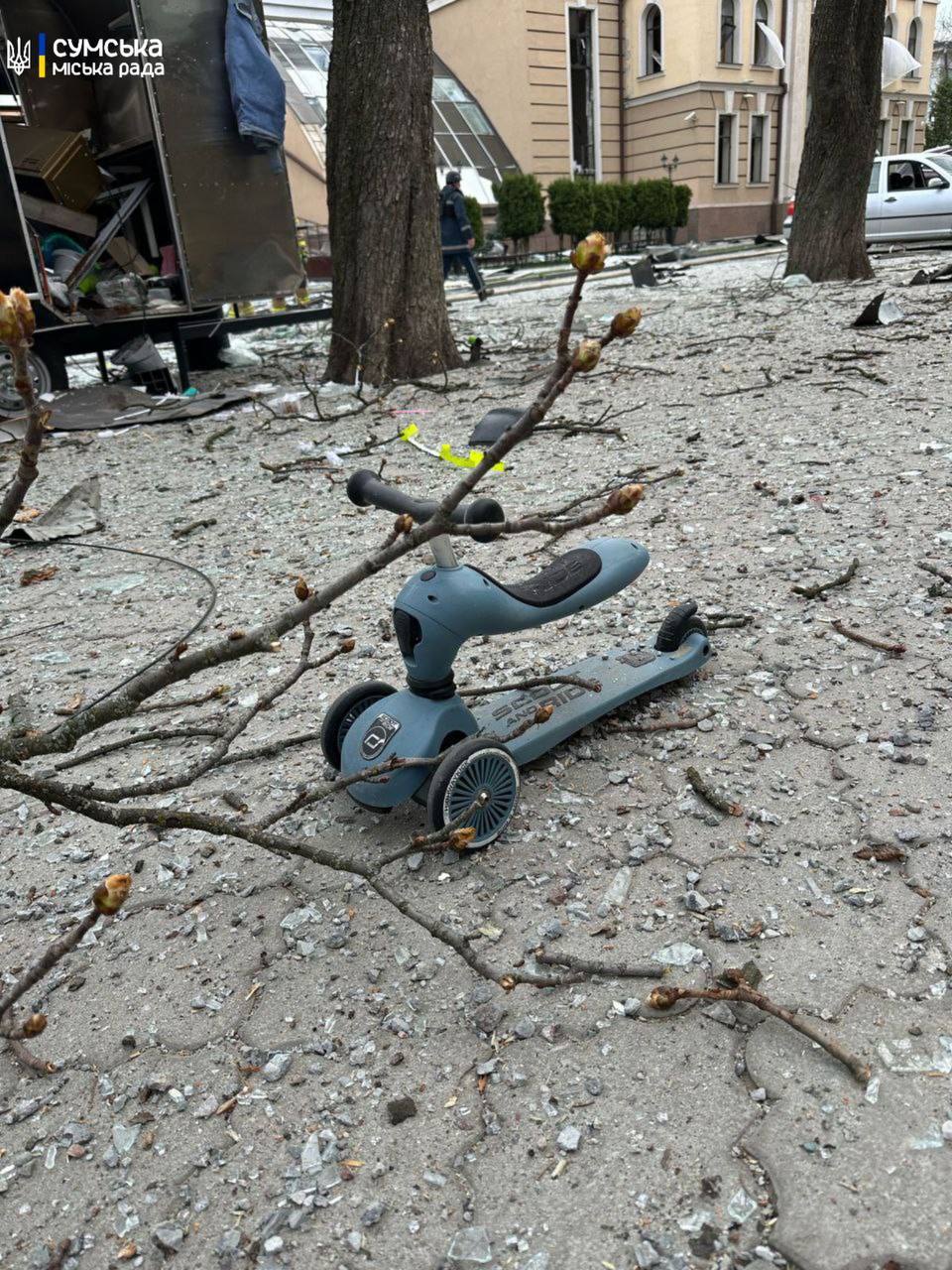 "Очередное кровавое преступление россиян против мирного населения Сумской области. Сегодня утром враг ударил двумя баллистическими ракетами по центру Сум. К сожалению, пострадали люди", - написал глава Сумской ОВА Владимир Артюх.