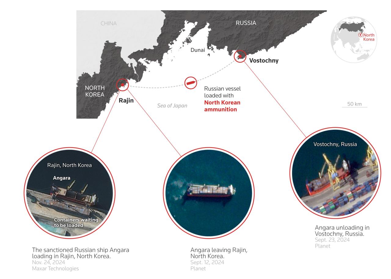 Снаряды переправляются по железной дороге на склады близ границы РФ и Украины, главным образом в Тихорецк. К перевозкам северокорейских боеприпасов были привлечены четыре грузовых судна под российским флагом: "Ангара", "Леди Р", "Мария" и "Майя-1".