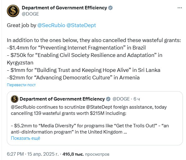 Государственный департамент США отменил 139 бесполезных грантов зарубежным странам на сумму 215 миллионов долларов.