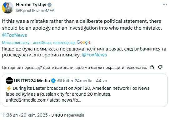 Украина требует извинений от американского телеканала Fox News за то, что тот в эфире обозначил Киев российским. Об этом заявил спикер МИД Георгий Тихий