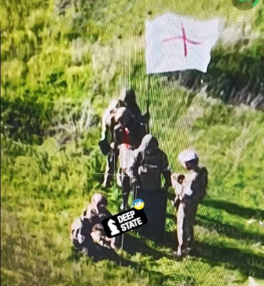 Во время перемирия россияне под белым флагом с красным крестом забирают с поля боя тела погибших солдат армии РФ.