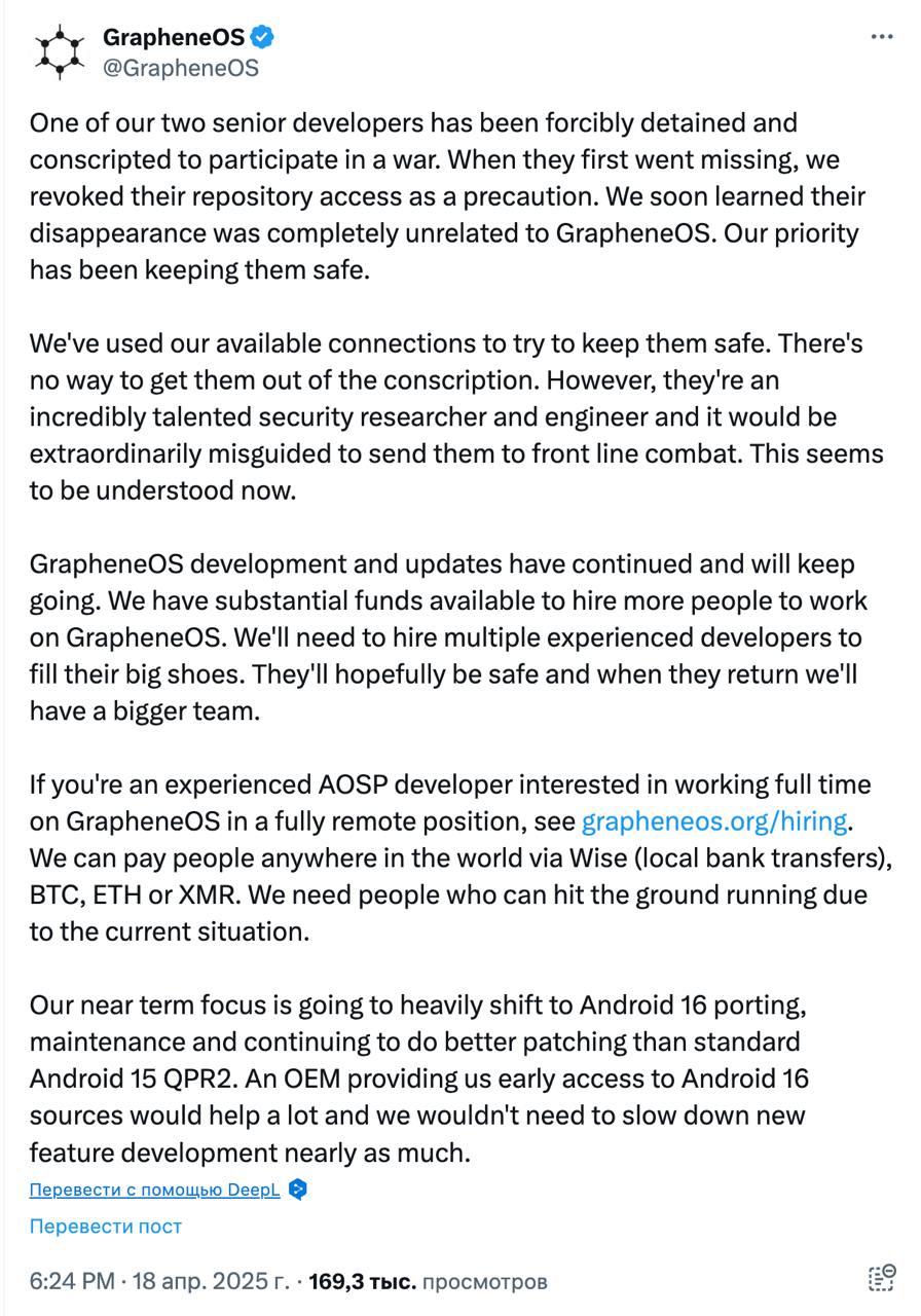 18 апреля официальные аккаунты GrapheneOS написали, что пару недель назад один из двух ведущих разработчиков проекта "был насильно задержан и отправлен на войну". По словам коллег, сразу после исчезновения "в качестве меры предосторожности" отозвали его доступ к проекту.