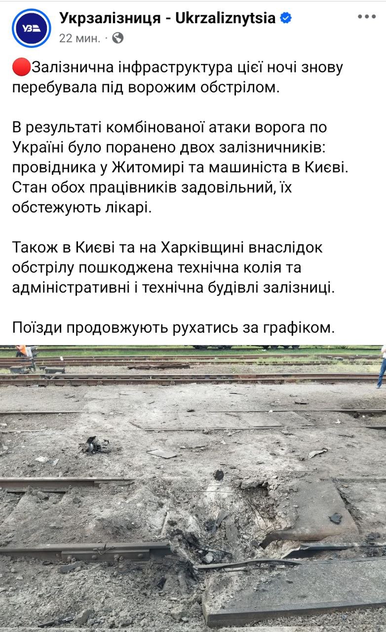 07:52 Во время воздушного удара по Украине были атакованы объекты железной дороги.