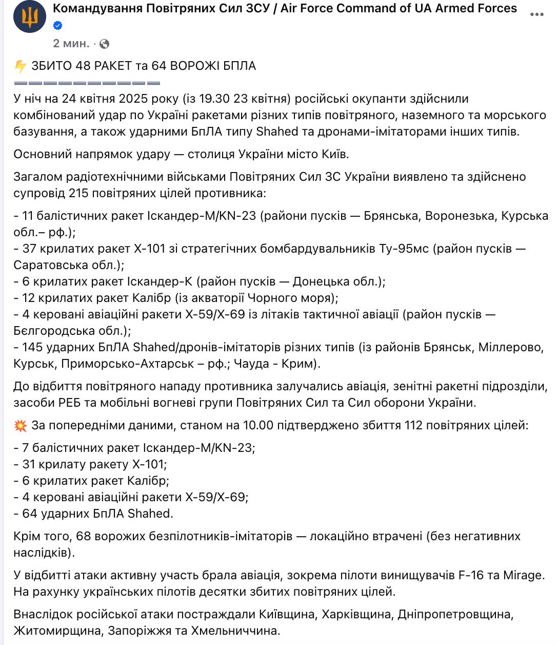 10:04 Воздушные силы сообщают, что этой ночью сбили 48 ракет из 70 и 64 "Шахедов" из 145 (еще 68 "локационно потеряны без негативных последствий")
