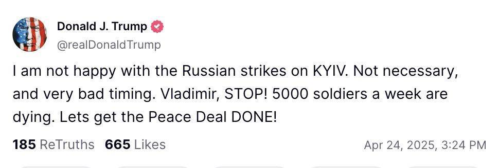 «Я недоволен ударами России по Киеву. Это было совершенно не нужно и крайне не вовремя. Владимир, остановись! Каждую неделю гибнет по 5000 солдат. Давайте наконец заключим мирное соглашение!» - написал Трамп.