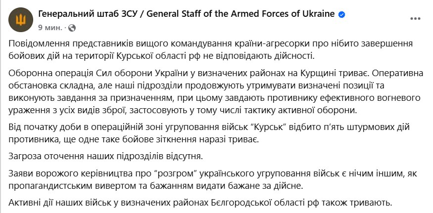 "Операция Сил обороны Украины в определенных районах Курской области продолжается. Активные действия наших войск в определенных районах Белгородской области РФ также продолжаются", - говорится в сообщении.