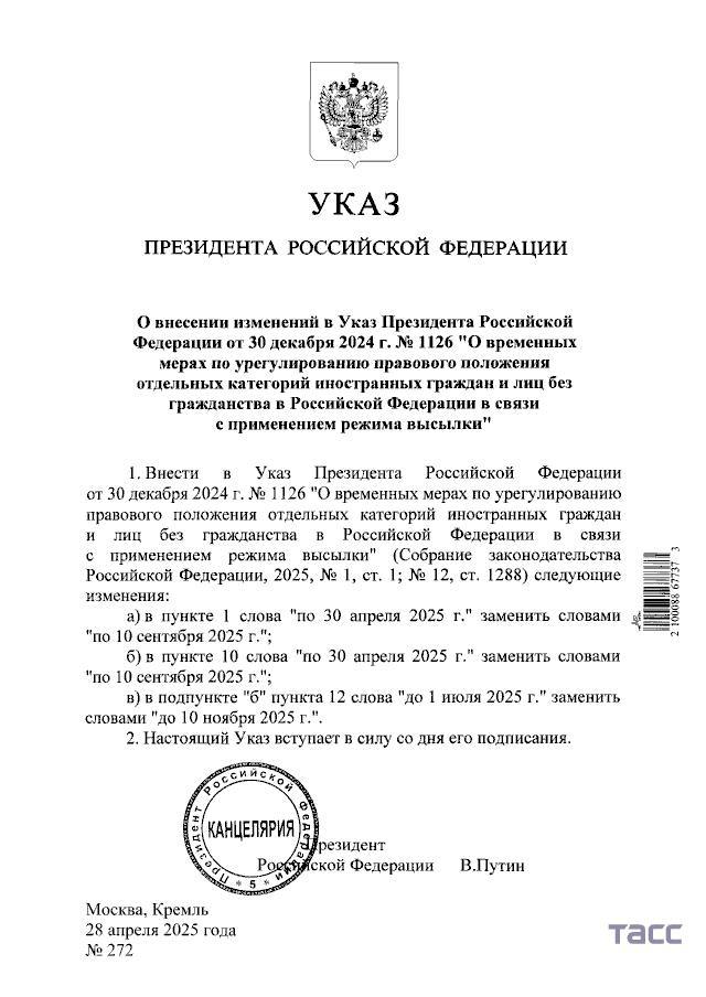Путин продлил срок легализации иностранцев в России. Указ