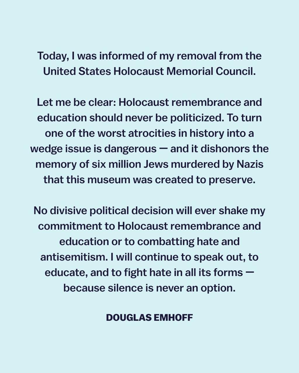 "Память о Холокосте и образование в этой сфере никогда не должны становиться предметом политизации. Превращать одно из самых ужасных преступлений в истории человечества в предмет споров опасно и оскорбляет память о шести миллионах евреев, убитых нацистами, которую этот музей должен сохранять", – написал Эмхофф.